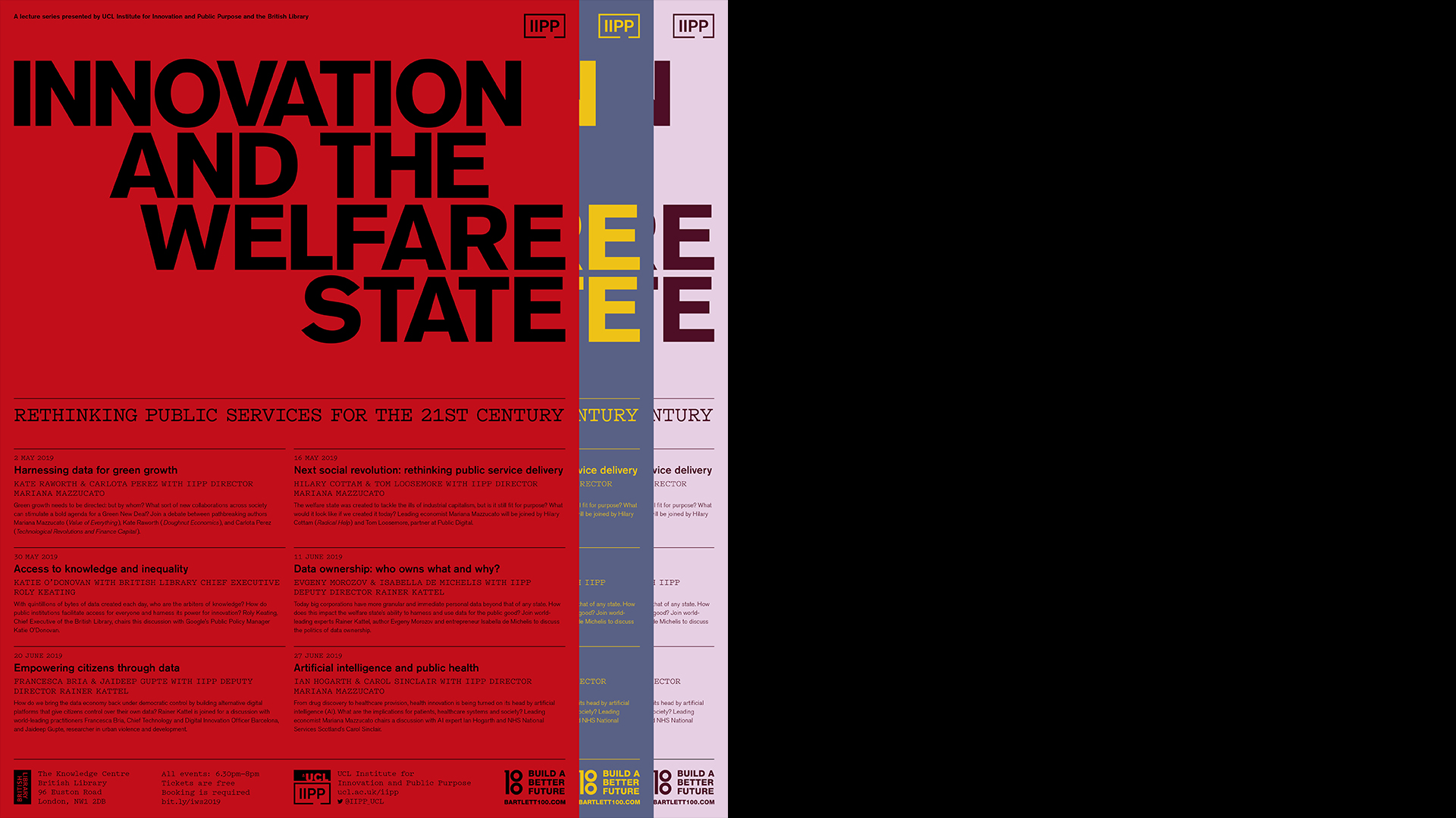2019 saw the roll-out of our visual identity for the UCL Institute for Innovation and Public Purpose (IIPP). Developed through a process of collaborative workshops with the IIPP team, Publica’s graphic design team set out a new bold and ambitious visual identity to clearly communicate the vision and values of IIPP. Our brand guidelines form an overarching visual framework, within which we produced designs for the public lecture series Innovation and the Welfare State and the design of the report A Mission-Oriented UK Industrial Strategy launched at Senate House in May.