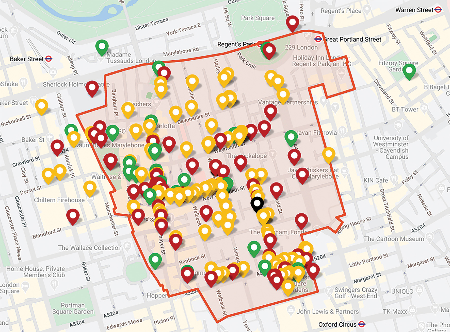 The Harley Street BID area contains some notable destinations, including the retail and leisure activity of Marylebone High Street, the healthcare cluster surrounding Harley Street, and Portland Place. Alongside this, the area also has a significant residential population.