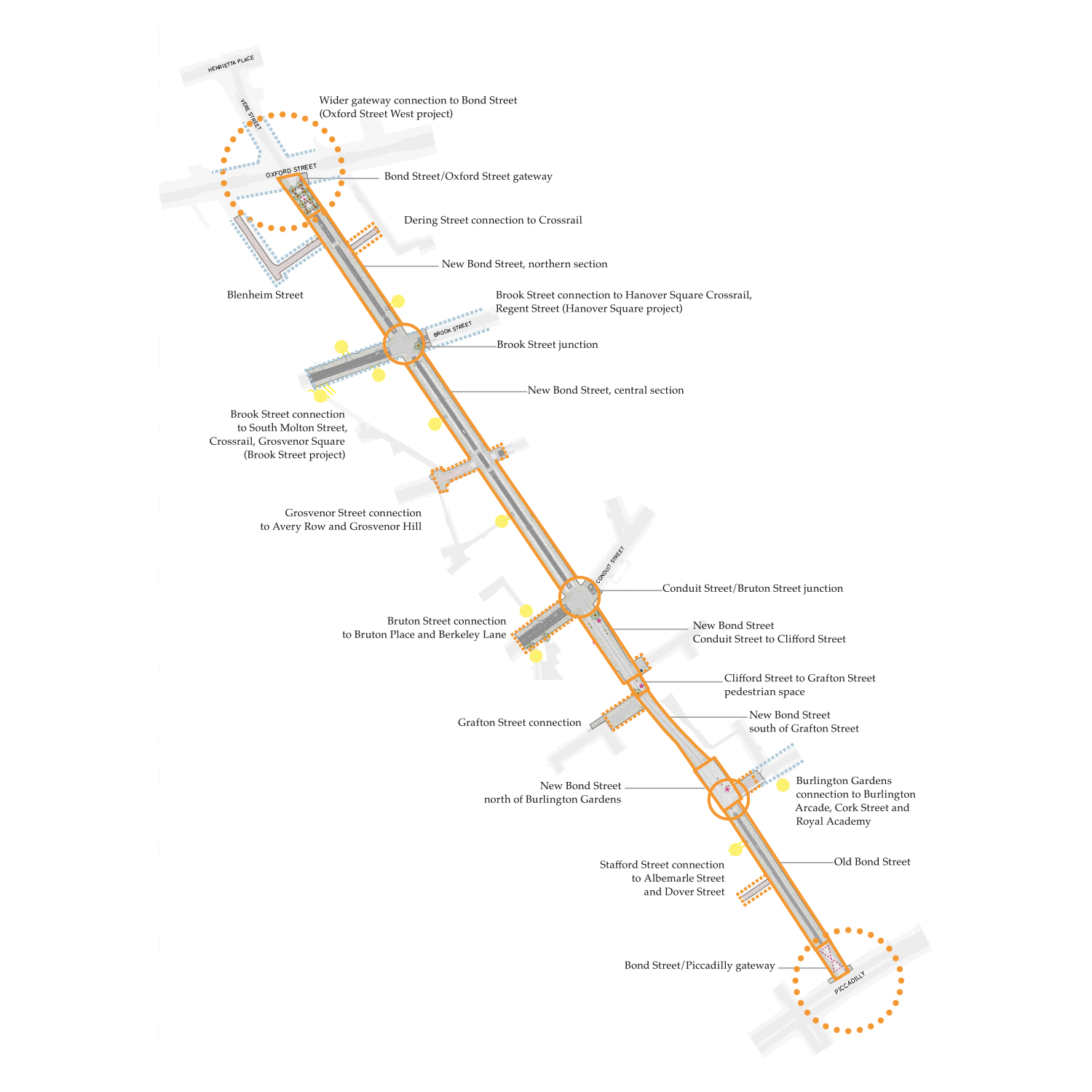 The design matches Bond Street’s public realm to its international reputation and builds a unique identity for Bond Street that is also integrated with Mayfair, the West End and Westminster as a whole.