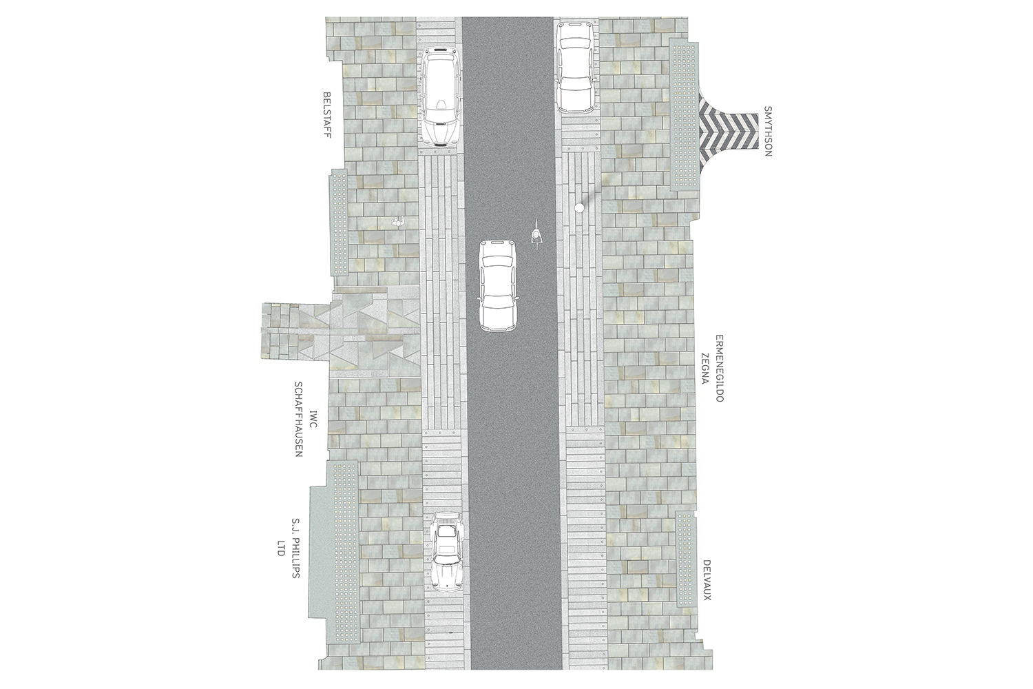 Plan view of the paving design for Bond Street. Large Yorkstone paving slabs for footways; Cornish granite for kerbs.