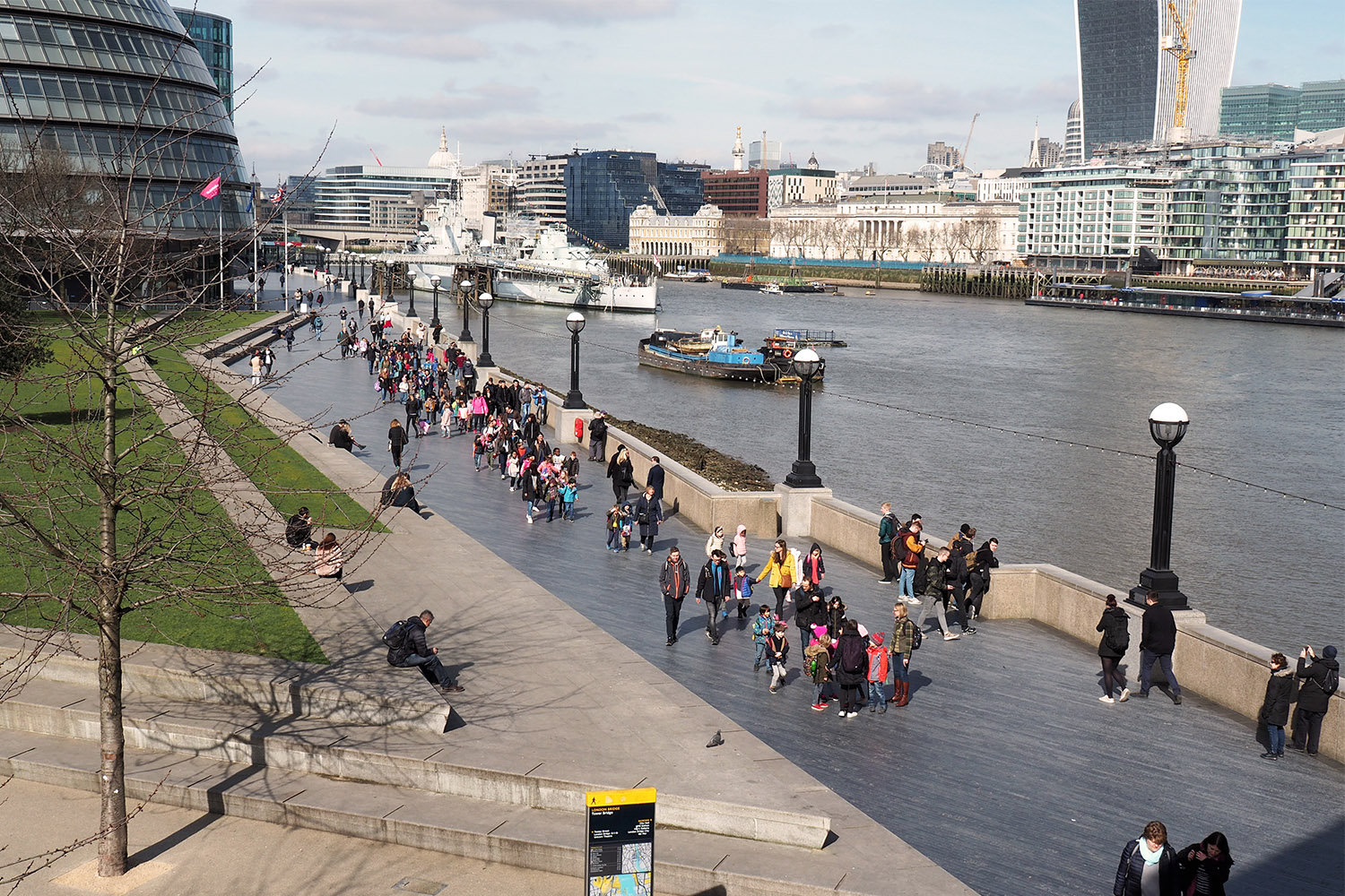 Potters Field Park, central London: The riverside promenade at Potters Fields Park provides an important pedestrian thoroughfare with sweeping views of the river and iconic views of central London landmarks including HMS Belfast and City Hall. Lawns and terraces offer opportunities for contemplation and rest.