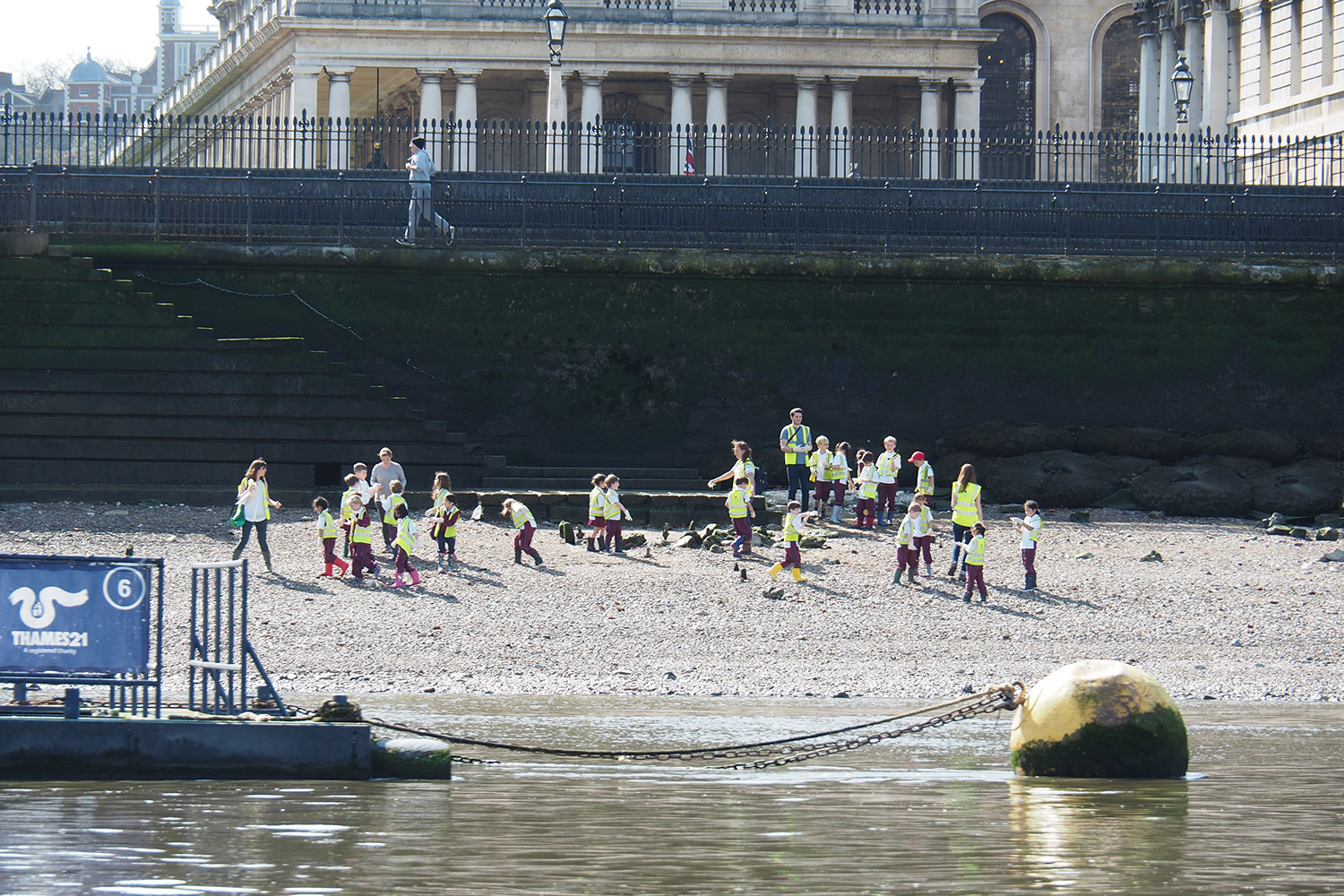 Old Royal Navy College, Greenwich: A group of children explores the foreshore by the Old Royal Naval College, Greenwich. According to historic accounts, the foreshore steps shown here were used to bring Lord Admiral Nelson’s coffin to the Thames, where it was placed in Charles II’s state barge and rowed up the river to Westminster for the funeral.