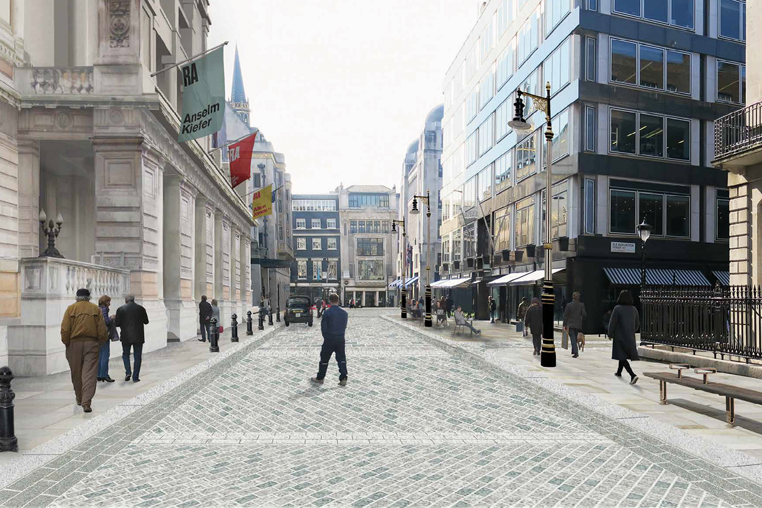 View of concept design for Burlington Gardens toward Old Bond Street: In front of the new entrance to the Royal Academy at 6 Burlington Gardens, the carriageway is expressed as a continuous ‘carpet’ of crafted granite paving, visually inverting the hierarchy which usually exists between roadway and footway. Large emphatic lamp columns help define the space in relation to the architecture of the Royal Academy.