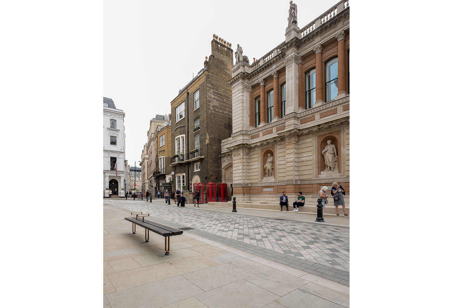 On Burlington Gardens, the design relates closely to the Royal Academy of Arts entrance creating a suitable setting for this historic building through subtle and timeless design moves including; the use granite setts in the carriageway in an alternating layout, provision of new seating, upgrading of lamp columns, and upgrading of iconic features such as coal holes and telephone boxes. A number of bollards were required to protect the Royal Academy basements, these were specified to relate closely to existing and proposed metalwork and carefully located to relate to the building whilst avoiding underground utilities. The scheme will reduce the dominance of traffic and improve the accessibility of the street for all users.