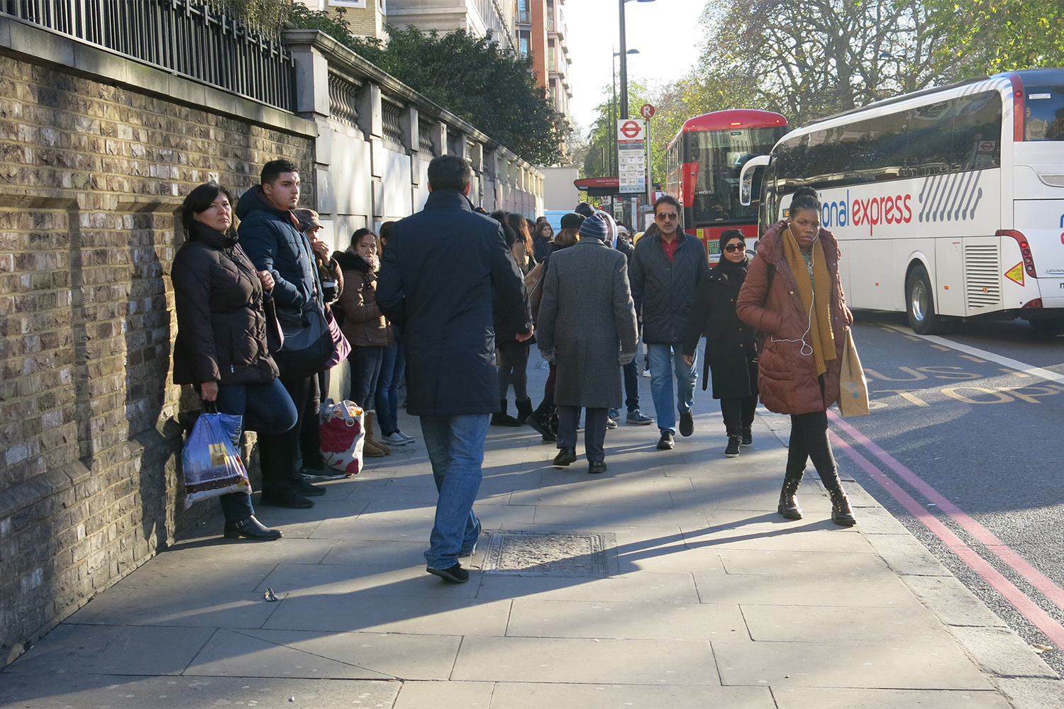 Pavements along Park Lane are narrow but heavily utilised by bus users and passers-by