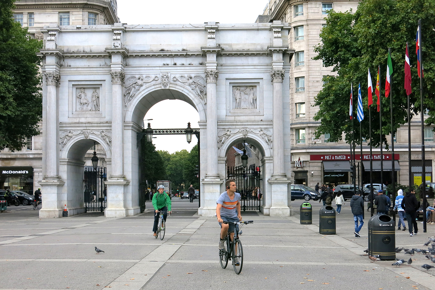 High quality and well-used cycling connections from Marble Arch through Speakers’ Corner and into Hyde Park are close by